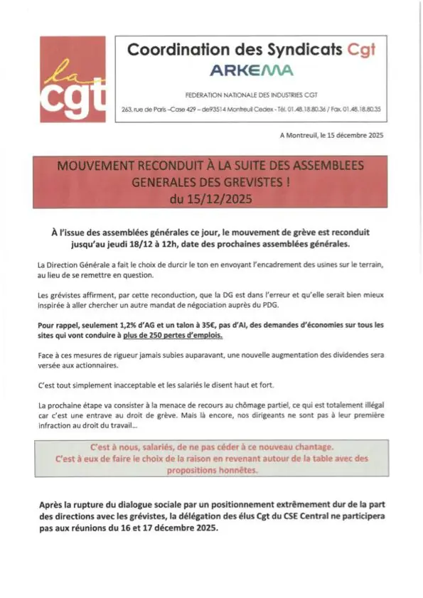 Nouvelle AG à ARKEMA le jeudi 18/12 à 12h suivie d'un barbecue. La CGT ARKEMA et les salariés sont mobilisés depuis le 11/12 pour l'emploi et les salaires. La direction convoque un CSE extraordinaire jeudi 18/12 à 15h.