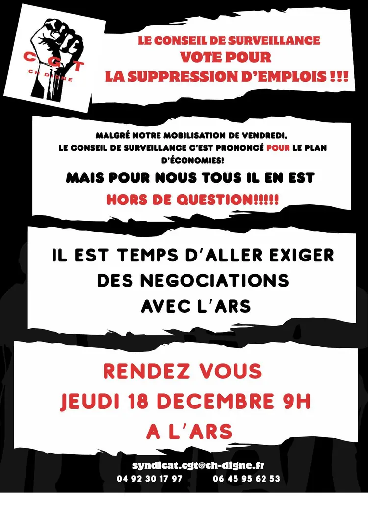 Dans la continuité de vendredi 12 décembre qui n'a visiblement pas suffit. L'ARS nous reçoit pour négocier le jeudi 18/12 à 9h.