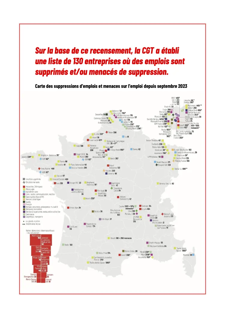 À partir des connaissances des organisations, la CGT a dévoilé une carte des 130 plans de licenciement, soit 33 021 emplois directs supprimés ou fortement menacés.